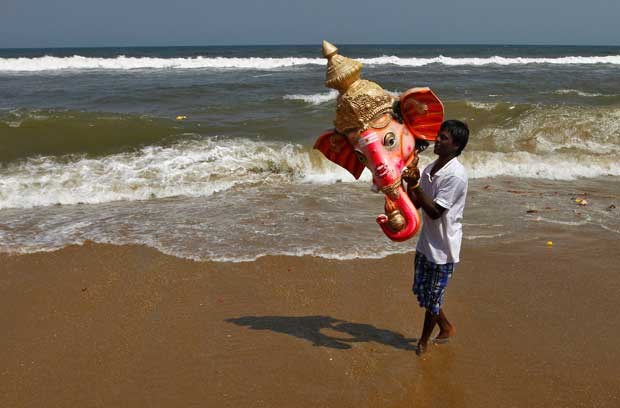 ÍNDIA, 23/09/2012. Um devoto transporta uma estátua do deus hindu Ganesh, depois de mergulhá-lo na baía de Bengali, durante o festival dedicado a Ganesh em Chennai (antes Madras) Babu Babu/Reuters