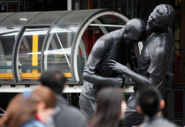 FRANÇA, 26.09.2012. Estátua de Zinedine Zidane que recorda o momento em que o futebolista deu uma cabeça no italiano Marco Materazzi durante a final do Mundial de Futebol em 2008. Obra do artista argelino Adel Abdessemed, colocada à frente do Centre Pompidou em Paris Christian Hartmann/Reuters