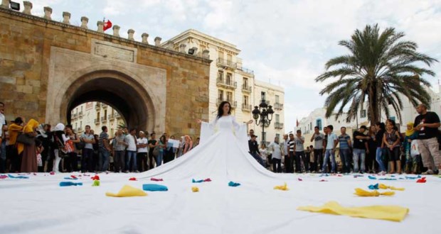 TUNÍSIA, 26.09.2012. Uma artista em gigantesco vestido branco, em Tunes. Os espectadores escreveram os seus desejos e esperanças no tecido. Parte de um festival artístico. Zoubeir Souissi/Reuters