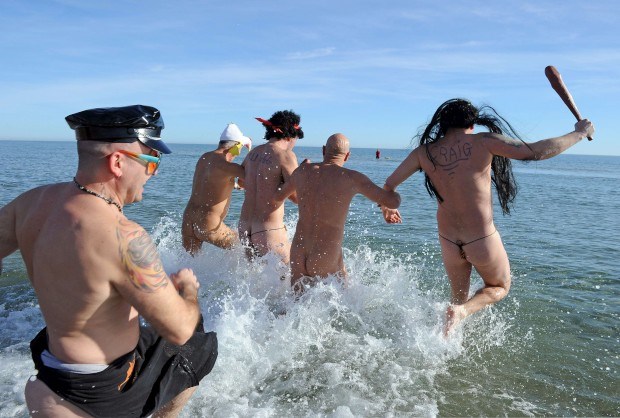 FRANÇA, 31.12.2012. Uma tradição global, o banho de fim de ano e/ou ano novo. Aqui, um grupo diverte-se numa praia nudista de Le Cap d'Agde Pascal Guyot/AFP