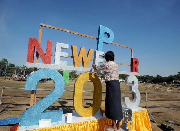 BIRMÂNIA/Myanmar, 31.12.2012. A preparar os votos de um feliz 2013. É a primeira vez que o país faz a festa com contagem decrescente e fogos-de-artífico públicos para um novo ano. Em Yangon Soe Than WIN/AFP