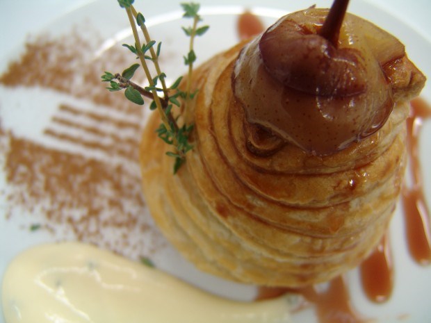 Pera recheada e coberta de mel e nozes, com creme de baunilha e redução de vinho do Porto DR
