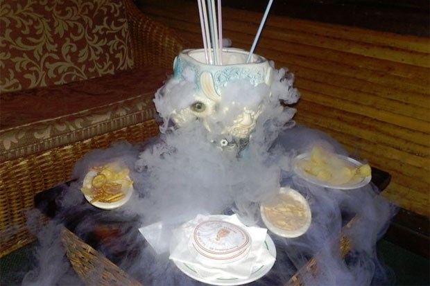 Pedimos uma bebida não muito doce nem muito alcoólica. Mas pode ter fumo? Sim, claro, todas as bebidas podem ter fumo. Afinal, é só azoto líquido, não é magia negra de poderosos deuses polinésios que vieram passar a reforma a Lisboa. Vem então um Dr. Funk (será possível ser mais anos 80?), beberagem criada por um médico "que encontrou a fórmula de curar todas as doenças dos trópicos à base de runs e sumos naturais - decida-se por esta fonte de saúde bebendo Dr. Funk". Decidimo-nos. Mas que seja num copo Mata-Maridos, porque o efeito do fumo é mais espectacular.