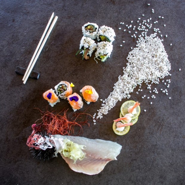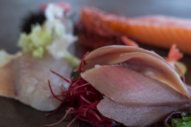 Numa refeição que, explica Rui Sales, foi pensada para evoluir de sabores mais suaves para os mais intensos, segue-se o sashimi acompanhado por algas tosaka e que inclui toro (a parte mais valorizada da barriga do atum), hamachi (um tipo de peixe muito usado no sushi), salmão, vieira e amaebi, um delicado camarão de água doce cujo sabor tem igualmente um ligeiro toque adocicado.