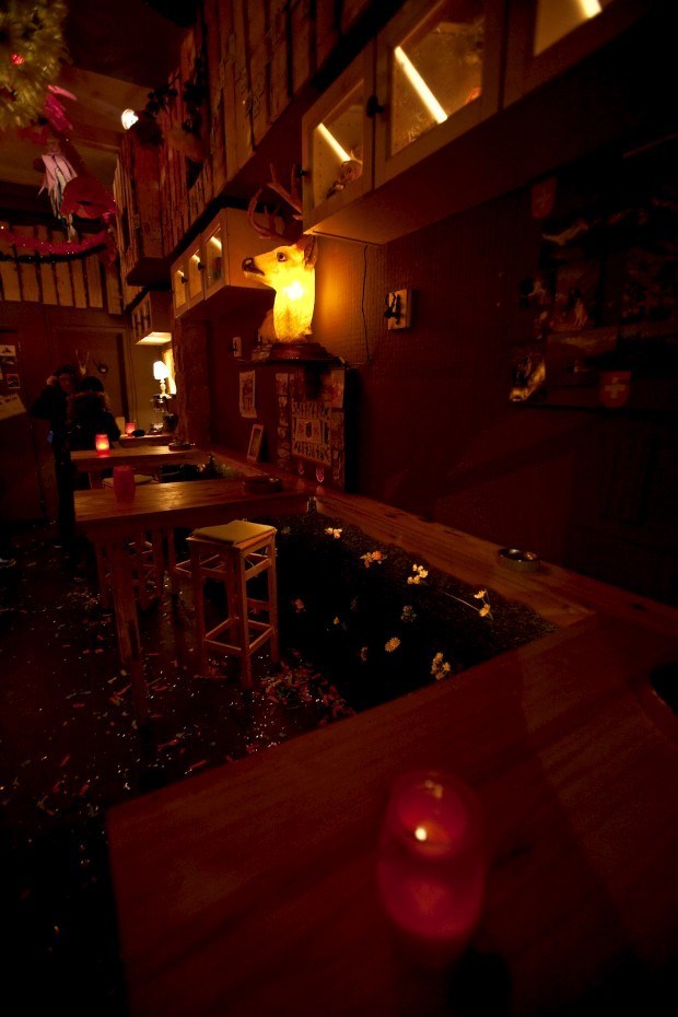 O cenário kitsch é à Heidi-Heidi (madeiras, florzinhas, relva artificial como se quer, bibelots ariscos...) mas o ambiente é liberal e aberto a todas as tribos e idades; as bebidas correm tão bem quanto a Heidi, algumas com trejeitos suíços; a música bate entre o pop e electro ou entra em variação ambiente em noites mais calmas.