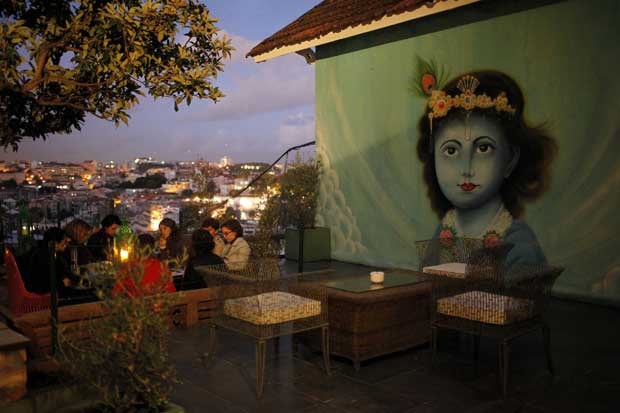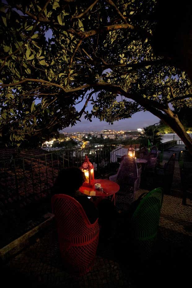 A surpresa maior vem a seguir: o magnificentemente íntimo jardim, nas traseiras do edifício. Sob a bênção dos ramos de anosas e frondosas nespereiras e de protectores e coloridos chapéus indianos, espalham-se mobiliário e itens made in India (tirando as mesas, que vieram de Marrocos mas casam muito bem com o resto). Há cadeiras e cadeirões (de metal, de verga), e até uma espécie de camas para o relax total de miradouro, mas a atracção maior até está mais escondida a um canto, uma romântica e ornamentada cadeira de baloiço que faz as delícias dos visitantes. E se os olhos primeiro vão a Lisboa, logo viajam até à Índia, cruzando-se com o olhar vivo de um divino e gigante retrato indiano, criado por grafitters numa parede.