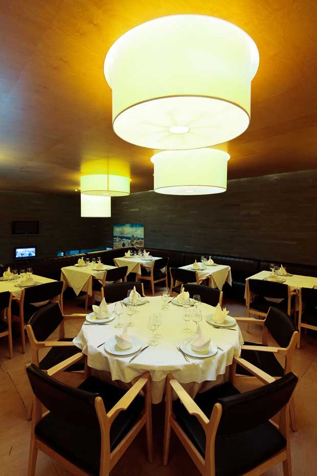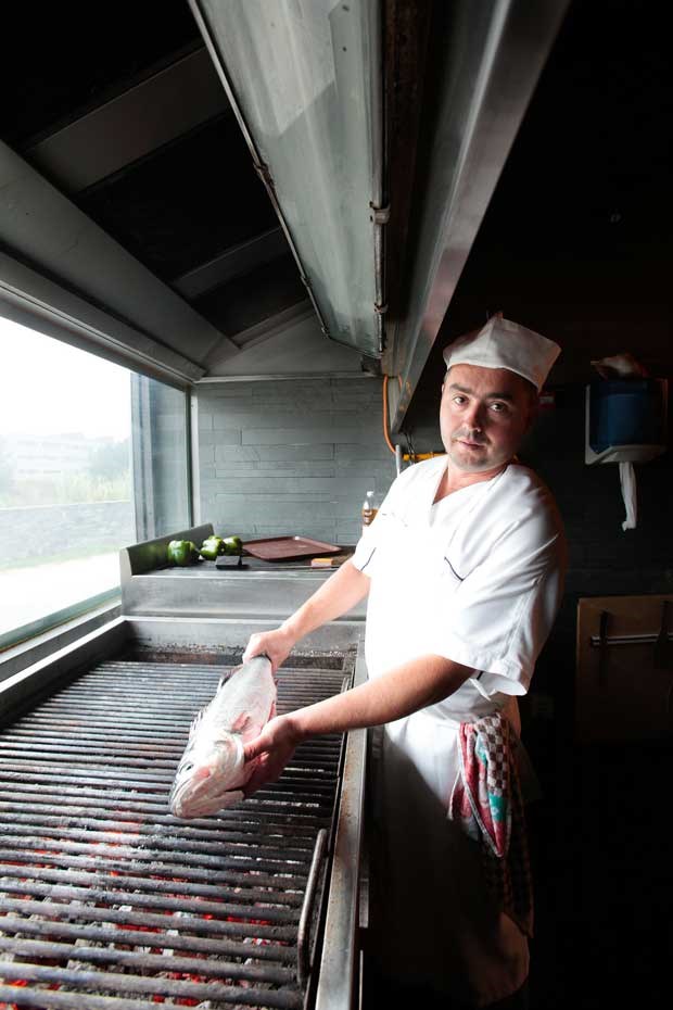 O critério arquitectónico e decorativo estende-se também ao estilizado aquário redondo onde estagiam alguns crustáceos, à espera de serem encaminhados para a cozinha, bem como à elegante vitrina com os pescados do dia. Exibia, entre outros, um valente robalo (aí para uns quatro quilos), que mais adiante haveríamos de, em parte, convocar para a mesa.