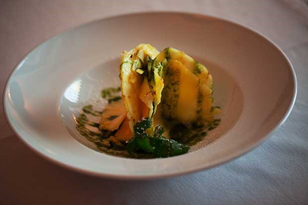 O aperitivo de boas-vindas, com gin, Porto branco e rodela de pepino, como que nos prepara para a lógica de fusão que domina o conceito gastronómico. A base são os produtos e a gastronomia tradicional, mas a experiência e andanças do chef cozinheiro por outros mundos conferem-lhe a vertente de elegância e sofisticação. Foi exactamente isso que logo revelou umas pequeninas "pataniscas de salmão". O conceito e a técnica das popularíssimas pataniscas de bacalhau aplicadas ao salmão. Finas, fofas e saborosas, na companhia de salmão fumado e frescas folhas de agrião, num conjunto visualmente muito apelativo resultante do cuidadoso e criativo empratamento.