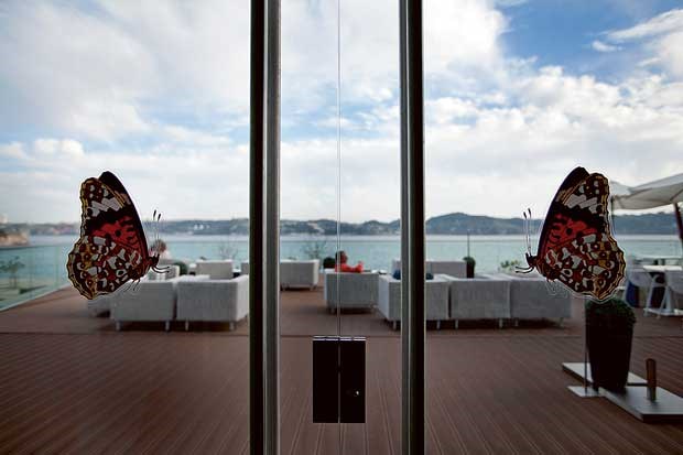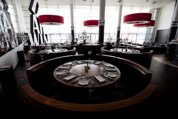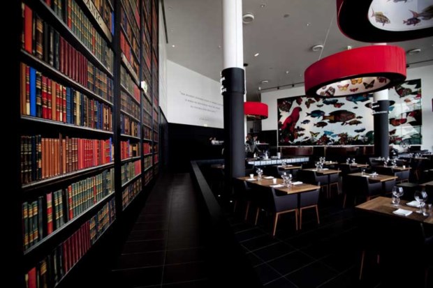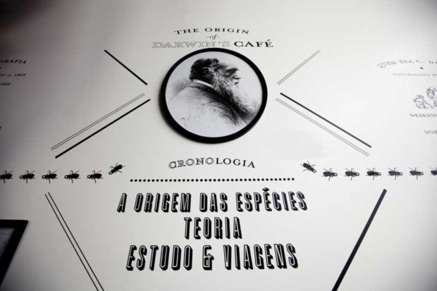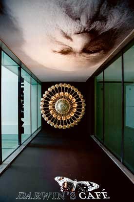 O rasgo arquitectónico de Charles Correa prolonga-se ao entrarmos no salão de refeições, com as vidraças em fundo a transformarem a paisagem exterior num postal vivo que forra a transparência da quarta parede do espaço. Uma primeira área de acolhimento recria ao de leve um gabinete privado, com grandes poltronas acolchoadas em pele e uns livros antigos a induzirem um ambiente de estudo, quiçá semelhante ao de outro Charles; Darwin, autor da teoria da evolução das espécies. A obra do naturalista inglês serve de leitmotiv para a inspirada decoração que a Lanidor criou ao ficar com a gestão do espaço. Citações do investigador, um painel grandioso com ilustrações de peixes e borboletas, a simulação de uma biblioteca num dos extremos e outros pormenores estilísticos compõem um cenário envolvente. Ainda assim, a sala apresenta-se um pouco intimidante, esmagando-nos com as suas proporções.