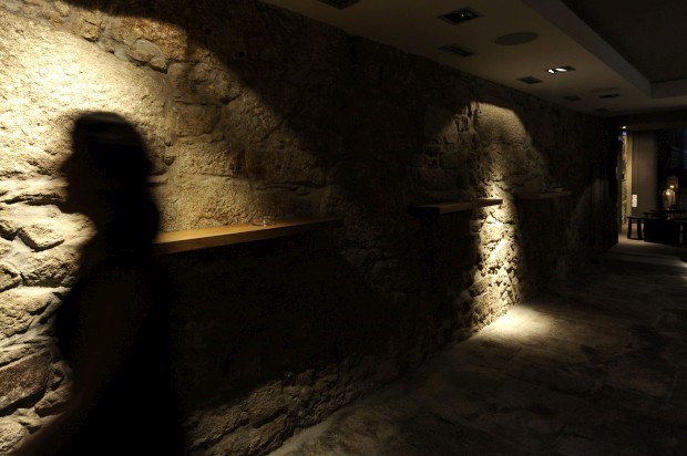 Quem entra encontra-se numa espécie de tasca revisitada, madeira nas mesas e bancos altos e no pequeno balcão no canto, grossas traves no tecto e paredes de granito. O espaço, invulgarmente comprido, é quase um túnel quando a sala estreita, garrafeira embutida na parede (o vinho é uma aposta declarada, com clara devoção pelo copo), e quando novamente alarga já é outra sala - o coração do bar, com o balcão principal. Arcadas, primeiro, escadas depois e portas de vidro no final demarcam as restantes áreas em que o bar se desdobra: mesas e bancos baixos na órbita da cabina de DJ e, subidos os degraus, uma zona de design explicitamente moderno. A parede do fundo é toda ela vidro a dar acesso ao último espaço, um pátio-terraço.