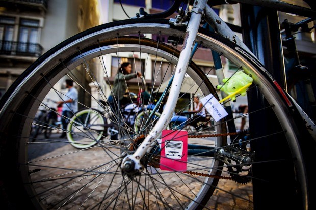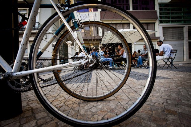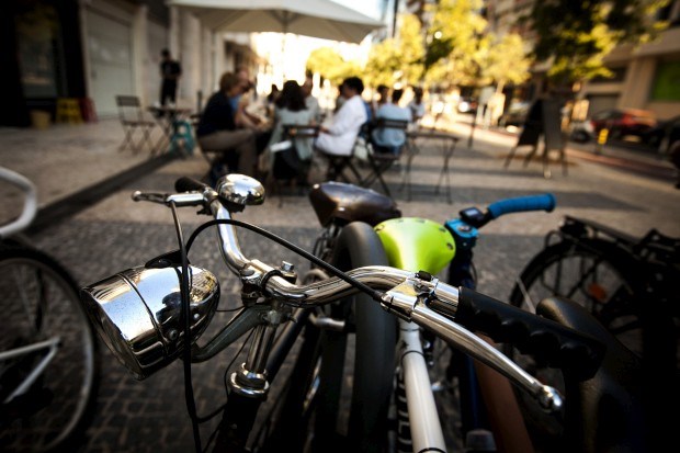A ciclista toca a campainha para alertar um homem que caminha no espaço reservado às bicicletas. A ciclovia da Avenida Duque de Ávila, em Lisboa, é um dos espaços da cidade a que nem todos ainda se habituaram, mas conta agora com uma nova atracção: o Velocité Café, um estabelecimento onde é possível entrar e estacionar o próprio modo de transporte.