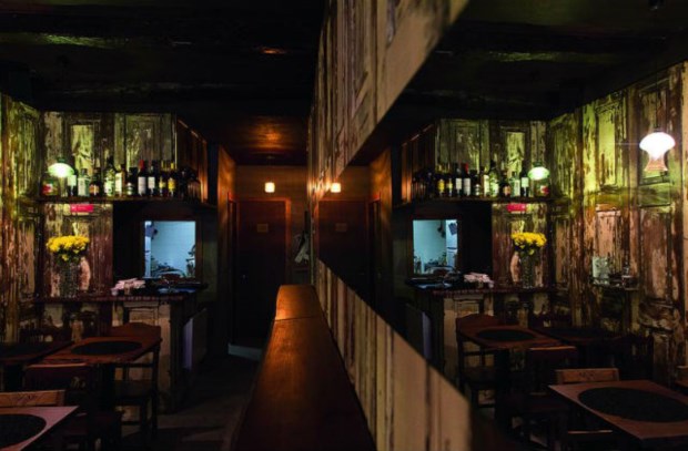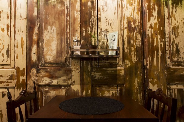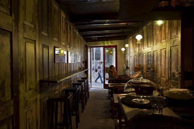 A arquitectura e decoração do espaço, escondido na subida em paralelos da Rua dos Caldeireiros, para quem entra na artéria pelo Largo dos Lóios, dão uma ajudinha. É uma pequena sala de cores quentes - da rua à cozinha vão poucos passos. O chão em paralelos cria a sensação de contínuo para a rua. "A ideia foi trazer a rua cá para dentro". Velhas portas de madeira (primorosamente lixadas e envernizadas) preenchem as paredes, com o desgaste do tempo a criar curiosos padrões.