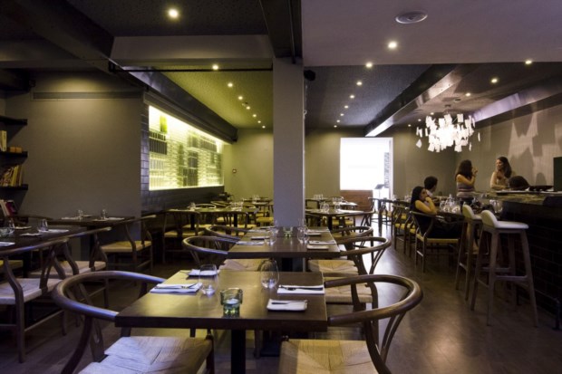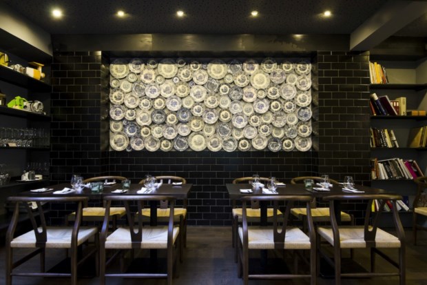 ...não na de sua casa, mas sim na outra parte interessante do projecto, ou seja, no restaurante que secunda o talho. Um espaço sóbrio e bonito com uma das paredes a exibir garrafas vazias arrumadas de forma esteticamente antagónica, enquanto ao lado um conjunto de pratos antigos compõe um curioso painel de cerâmicas na companhia de algumas máquinas fiambreiras de colecção. É por aqui que o jovem chef Kiko Martins dá largas à sua imaginação, enriquecida por uma viagem por diversos países onde se propôs "comer o mundo". Vivência que acaba por se reflectir no cosmopolitismo de um menu onde naturalmente só existe carne.