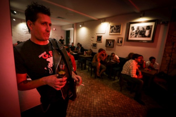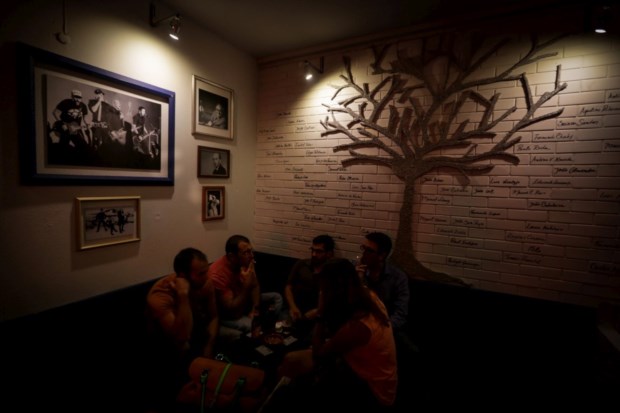 Entramos. À esquerda, uma imagem antiga do bairro, com calhambeques e ainda sem igreja. À direita, portas e janelas de madeira. Em cada portada, uma letra da palavra Popular, em lettering criado por Tó Trips. O músico dos Dead Combo desenhou também o logótipo do bar, que incorpora a estátua de Santo António, ícone do bairro. Lá dentro, uma sala em U, com um palco em ângulo visível de qualquer ponto e preparado para receber música a qualquer momento. Nas paredes, um álbum de memórias, feito de fotografias de quem vive, viveu ou passou pelo bairro em determinada altura. Bandas, muitas. Alguns escritores. Cartazes de filmes também. Ao fundo da segunda perna do U, há uma árvore estilizada que prolonga o tema, numa parede de tijolos onde estão escritos nomes que vão do rock à nata intelectual. Os tijolos em branco guardam-se para lembranças futuras.