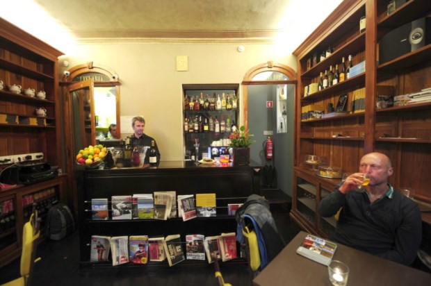 A pequena sala recebe-nos com um balcão, no centro - também escaparate para jornais, revistas, à disposição de quem entra -, e o espaço completa-se com duas mesas, iguais às da esplanada para se expandir para o andar de cima, outra pequena sala, duas janelas para a rua: mesas quadradas com tampo de mármore, cadeiras antigas recuperadas, um sofá a acompanhar a parede, uma estante que veio do andar de baixo e foi pintada à cor desta sala (verde seco), um candeeiro "aranha" vintage (vindo do quarto do proprietário) e porções de parede espelhadas a ampliarem o espaço onde se respira algo dos velhos cafés literários.