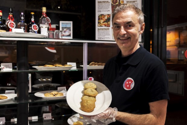 Em sentido restrito, estas bolachas americanas que querem conquistar Lisboa são as “famosas drop cookies”. Digamos, bolachas caídas - o que quer dizer que não são as bolachas esticadas com o rolo mas sim aquelas em que se deixa cair cuidadosamente a massa sobre o tabuleiro. Feitas por Karl, saem em várias fornadas pelas mãos de Greg. Karl também lhes chama “soft baked” porque algumas são meio cozidas, o que lhes confere uma textura mais suave e amanteigada (e que, como podemos comprovar, derretem na boca).