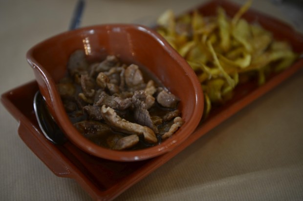 Assim que entrámos, ouve-se o óleo a crepitar. Maria, a responsável pelos petiscos, está a fritar as cascas de batata que acompanham o pica-pau. O ambiente é acolhedor. Um imponente balcão de madeira e de tampo em pedra, algumas mesas quadradas dos mesmos materiais e bancos de madeira. Um casal junto ao vidro vai conversando e petiscando entre copos de vinho. As mesas junto à porta têm vista para a rua e é aqui que ficámos à conversa.