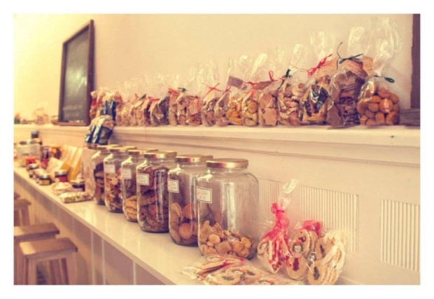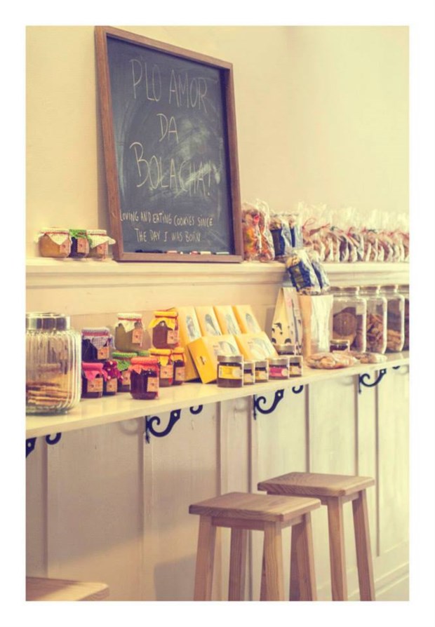 Há bolachas e biscoitos, de várias formas (estrelas, pinheiros, bolas, suspiros...), doces e salgados, em grandes boiões de vidro e tampo dourado; há bolos aconchegados em pratos tapados que se exibem no balcão. O cenário tem algo de atmosfera de mercearia antiga, mas a vibração é totalmente contemporânea. Um DJ passa música (esperem-se blues, jazz, rockabilly, oldies, alguma alternativa) no fundo da sala; à frente, mesa baixa e almofadas, bebe-se vinho e comem-se bolachas, redondas, grandes, com vista para a escuridão deste final de tarde chuvoso.