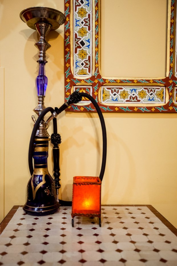 À entrada, já se nota que este é um espaço distinto. Os motivos árabes desenhados na montra e os típicos cachimbos de shisha pousados sobre as mesas são os primeiros sinais de que vamos passar a outros mundos. Pela sala principal prossegue o ambiente que vai buscar a Marrocos e à Tunísia muita da sua inspiração e, daqui, seguimos para uma pequena área mais reservada, um verdadeiro recanto árabe, onde sofás com base de madeira trabalhada se conjugam com grandes almofadas em tons de laranja, vermelho e amarelo, entre paredes que seguem o mesmo padrão de cores.