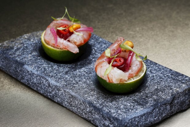 Espreitemos então um dos menus propostos. O 1º acto é uma caipirinha (esta, por exemplo, faz parte dos menus do Belcanto) sob a forma de uma pequena esfera gelada, que se quebra na boca, libertando o líquido que tinha no interior. Teatro, portanto. Como teatro é o amuse bouche que vem a seguir: azeitonas explosivas versão XL (estas inspiradas no elBulli), que também rebentam na boca, libertando o intenso sabor a azeitona, e o Ferrero Rocher, que parece exactamente o chocolate, mas não é (e que é igualmente servido no Belcanto). Este 2º acto termina com gambas do Algarve em ceviche, servidas sobre uma lima cortada ao meio.