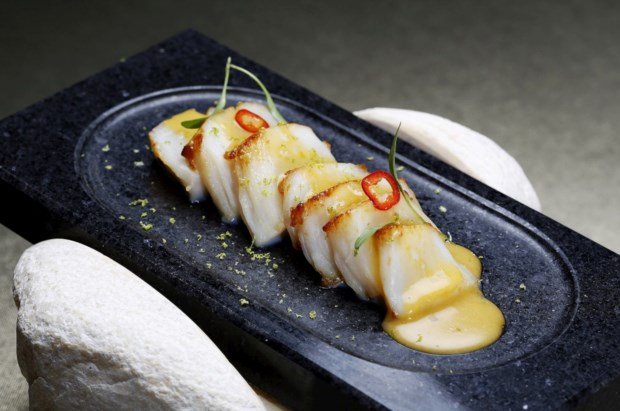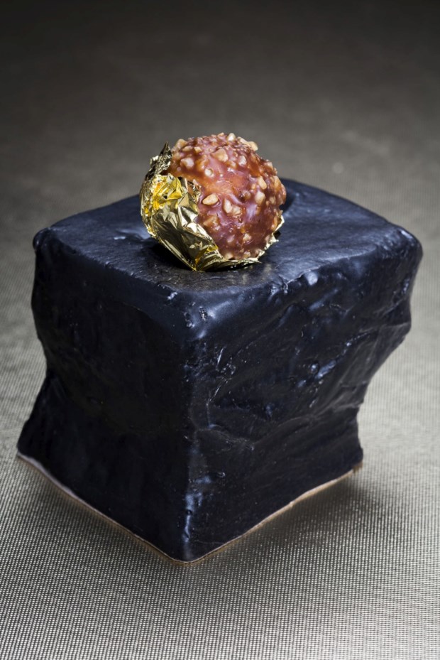 Passamos para o 3º acto, continuando os sabores frescos e com um toque asiático, com um “cornetto” temaki de tártaro de atum com soja picante. E o tom mantêm-se no 4º acto: vieiras salteadas som sabores Thai, servidas numa pedra branca e irregular. No 5º acto dá-se uma reviravolta na acção: chega a carne. Primeiro um JAburguer DOP, com carne barrosã, saborosíssima, num pão muito leve, e depois um arroz de bochecha de vaca com parmesão, que, explica o chef, é feito inicialmente com um estufado de mão de vaca, o que lhe dá a leve gelatina que o une e torna impossível não rapar o pequeno tacho em que é servido.