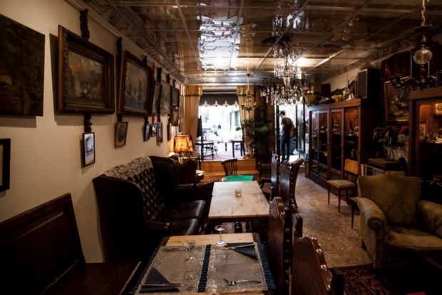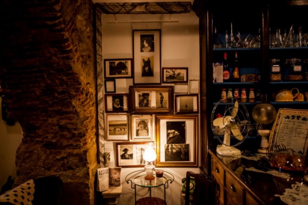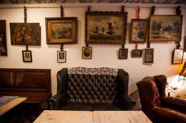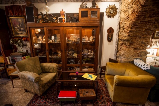 Entre pequenas mesas com naperons e sofás antigos, alguns já coçados, outros com almofadas em veludo, há um quadro que se destaca dos demais. “É uma velha a escolher porcelanas, com um xaile à portuguesa de flores e rendas e um carrapito no alto da cabeça”, conta à Fugas António Vicente, sócio do espaço e arqueólogo de profissão.