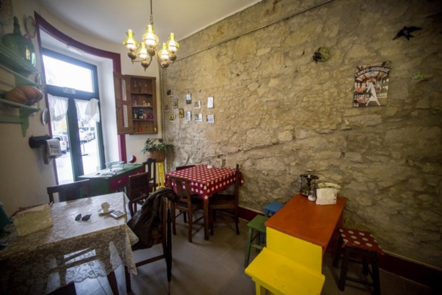 Ainda na primeira sala, a sala do “chá”, por detrás do pequeno balcão, há uma parede em ardósia preta que dá as boas-vindas a quem entra e dá a conhecer algumas especialidades da casa. Já na sala do fundo, da “oficina”, que a proprietária pretende utilizar também para pôr o seu hobby do restauro em prática, a ardósia vermelha, os bancos pequenos pintados com cores quentes e as mesas baixas, fazem as delícias das crianças. “Os pais ficam a beber um café descansados aqui na sala da frente e as crianças brincam ali. É um espaço dois- em-um”, diz.