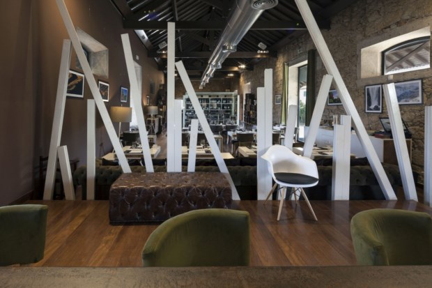 Porque a divisão básica é simples: de um lado, wine bar, com dois grandes balcões à laia de mesas comunais e caixas de madeira como estantes-expositoras de vinho; do outro, restaurante, o branco mais presente no mobiliário e nas formas bizarras que são como biombos indisciplinados (e sobressai a garrafeira, “caixa” transparente).