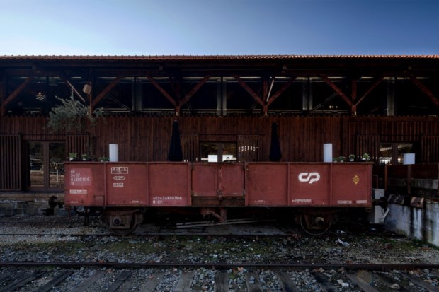 A ideia de manter a traça do edifício e criar um espaço ousado foi concretizada, considera. Destaca-se no antigo conjunto ferroviário branco o edifício pintado de castanho-chocolate, debruado a pedra nas esquinas e a rodear as janelas, com telhado inclinado suportado por vigas de madeira — parece quase uma peça colocada à parte, a coroar o volume. Há repas de madeira numa das fachadas, um acrescento aproveitando o beiral grande, e a rodear a esplanada — um toque de modernidade circunspecta, que acrescenta conforto.