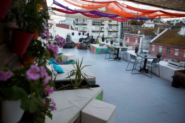 No café-sala de estar abrem-se as portas para o "terraço-jardim", espaço aberto a vista interior de bairro. Há velhas mesas e cadeiras, puffs pintados, quase-camas, bancos reinventados. E, acima de tudo, um jardim em desenvolvimento com as mais variadas e coloridas plantas. Há caixinhas com várias maravilhas, de tomates a pimentos ou suculentas. Há quadros de madeira na parede com vasos de flores, há caixas transparentes com cactos, há plantas em garrafas cortadas reaproveitadas, há até uma sanita tornada vaso de onde desponta um grande cacto.