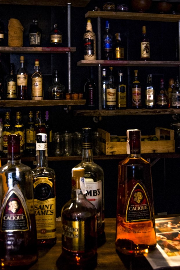 Atrás do balcão, sobre um pedaço de parede negra, velhas tábuas de madeira vão, por isso, emoldurando garrafas de diferentes tamanhos, feitios e cores. Cada rótulo, um destino. Venezuela é o país mais bem representado, como seria de esperar, mas há rum de Trinidad e Tobago, Jamaica, Colômbia, Guatemala, Inglaterra, Cuba, Porto Rico, Estados Unidos, Martinica, Nicarágua, República Dominicana... até um português, produzido na Madeira. Alguns possuem ainda um travo a flores, outros a café ou a chocolate.