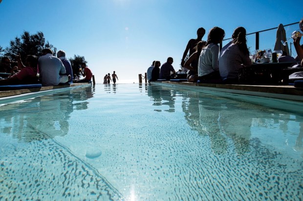 A nortada (que rima com Verão nestas paragens) obriga os guarda-sóis cor de linho a manterem-se recolhidos. O sol derrama-se sem pedir licença sobre a esplanada, quase cheia — a única sombra pode ser conseguida nas camas que se alinham de um dos lados da piscina, para além de mesas, mas ninguém as ocupa: os dosséis de madeira simples, cobertos de tecidos brancos, estão apenas povoados de almofadas. São as mesas que ocupam grande parte do espaço, “árvores”, chama-lhes Ernesto Pereira, que as desenhou e ajudou a executar na empresa familiar — o pé divide-se em ramos sobre os quais assentam o tampo, a copa, portanto, em contraplacado marítimo —, rodeados de cadeiras de braços e estofadas, como sofás; há ainda cadeiras de lona e um bar, quadrado, no topo da piscina (o mesmo onde está instalado um balcão onde ocasionalmente se cozinha à laia de show cooking). Em pouco tempo, da cozinha começarão a sair petiscos para a mesa que se une em torno da sangria de vinho tinto, que vem numa jarra e se serve com uma concha — distinguimos os ovos rotos com cogumelos e bacon entre os pratos que vão passando, todos com a assinatura do chef Elísio Bernardes (pode ter passado o magret de pato com batata doce, a cura de peixe ou alguma das propostas “entre duas fatias”, as sandes, versão cogumelos e queijo da ilha ou mozarella e tomate, por exemplo).