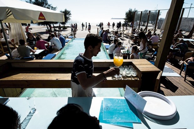Estamos no interior mas as paredes azuis claras puxam o céu para dentro, puxam a água, puxam a praia. Começam a colocar-se as mesas num local que poucas horas antes havia sido uma pista de dança em tamanho grande. Mas essa é uma situação de excepção. O interior do Sandhouse por estes dias pode parecer um excesso, mas passe o Verão e ganhará, com certeza, outro protagonismo. Bar de um lado, em torno de um balcão quadrado que abraça uma “árvore” feita de troncos que deram à costa perto da casa de Ernesto Pereira (estes são um elemento comum na decoração: compõem também candeeiros, dentro e fora), restaurante do outro, com outro balcão, este corrido, no mesmo estilo — madeira de pinho claro e rebordos brancos, para compor a imagem rústico-chique em tons de beira-mar que é a do Sandhouse. Claro que estes espaços não são estanques e as mesas do restaurante também são do bar, a mesa do DJ (embutida num tronco grosso) também está deste lado, acompanhando a “pista de dança”.