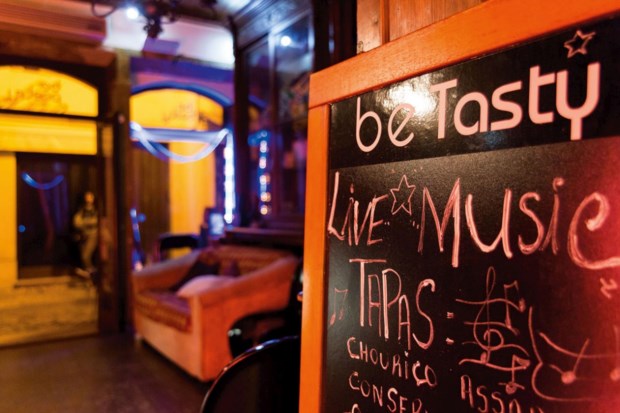 Já cantarolamos a “Casa da Mariquinhas” e Aida Bastos continua atarefada a servir gins, “saem muito”, confirma. O vinho já não tanto, os petiscos igual – “o público também mudou”, afirma, “mas no Verão, sobretudo, com os turistas, continuam a ter muita saída”. Tábuas, tostas, conservas, chouriço assado fazem parte do menu da casa, que Aida teima em salvar pela programação cultural, confessa, face ao desinvestimento dos proprietários. Os pergaminhos não são poucos, desde tertúlias a concertos – com um eclectismo que vai do rock paulista ao surf rock espanhol –, este Be Tasty/Be Poetry gosta da inquietude cultural. Por isso, garante Aida Bastos, apesar da irregularidade dos horários – “estamos num período de transição” –, quando abre é porque tem programação. Claro que o seu objectivo é reforçá-la, fazer o bar voltar aos tempos em que de terça-feira a sábado tinha a agenda cheia. E até a rua – hoje a esplanada parece-nos composta, Aida Bastos saca do telemóvel para mostrar a rua realmente cheia. “Já houve noites em que a polícia nos teve de mandar embora, às 5h, 6h da manhã”, conta. Hoje a polícia passa com acenos de cabeça – e o comentário de Vânia Couto: “Agora assustei-me um pouco com a polícia. Às vezes toco na rua e normalmente, quando a vejo, penso ‘tenho de me pirar daqui’”. Hoje ficou mais tempo do que pensava, a pedido da audiência, em mesas grandes e minúsculas (parecem quase bancos). Terminou com Manu Chao e a promessa de voltar.