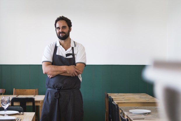 Foi o próprio Leopoldo quem desenhou o espaço, mesas de tampo de pedra, armários de madeira para arrumar as louças e as garrafas de vinho, livros de cozinha – de receitas, sim, mas também livros sobre restaurantes e outros feitos para quem gosta não apenas de cozinhar mas de pensar a cozinha – empilhados sobre os armários, moldes de sapatos na parede “em homenagem ao meu avô José António Calhau”. À direita de quem entra, o balcão, onde Leopoldo nos recebe, e, ao fundo, a cozinha, de onde o chef João Magro faz sair os pratos de ar apetitoso que vão chegando às mesas.