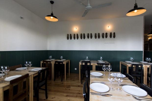 Foi o próprio Leopoldo quem desenhou o espaço, mesas de tampo de pedra, armários de madeira para arrumar as louças e as garrafas de vinho, livros de cozinha – de receitas, sim, mas também livros sobre restaurantes e outros feitos para quem gosta não apenas de cozinhar mas de pensar a cozinha – empilhados sobre os armários, moldes de sapatos na parede “em homenagem ao meu avô José António Calhau”. À direita de quem entra, o balcão, onde Leopoldo nos recebe, e, ao fundo, a cozinha, de onde o chef João Magro faz sair os pratos de ar apetitoso que vão chegando às mesas.