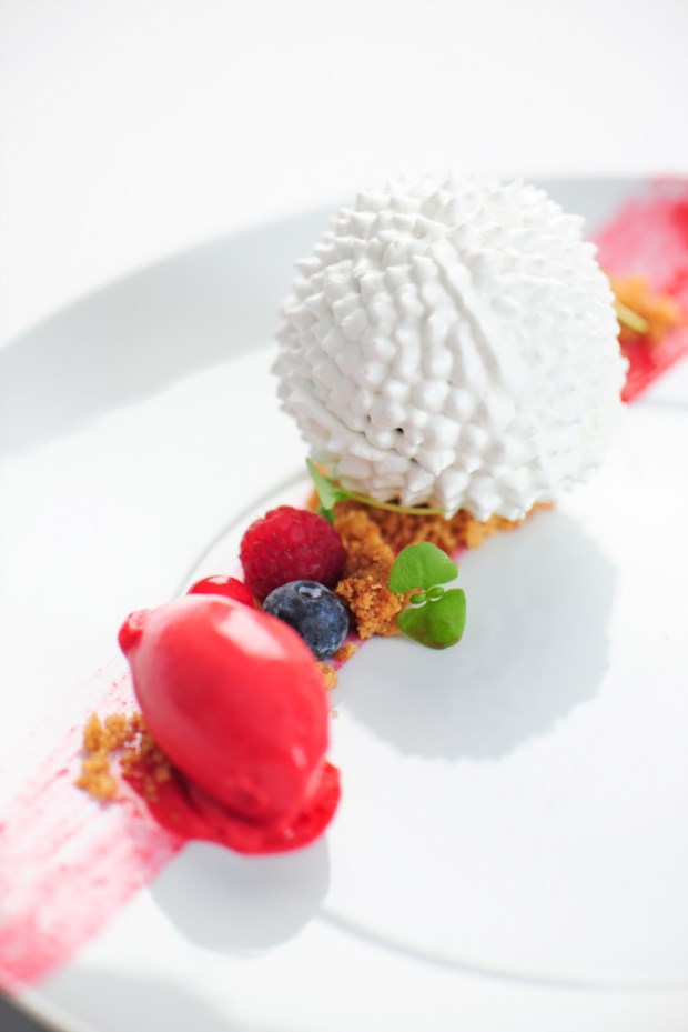 As sobremesas mantiveram o mesmo nível – elevado – de toda a refeição. Primeiro foi apresentado chocolate 70% com biscoito areado, avelãs crocantes e sorbet de pera. E, para terminar, uma belíssima esfera crocante recheada de texturas de frutos vermelhos.