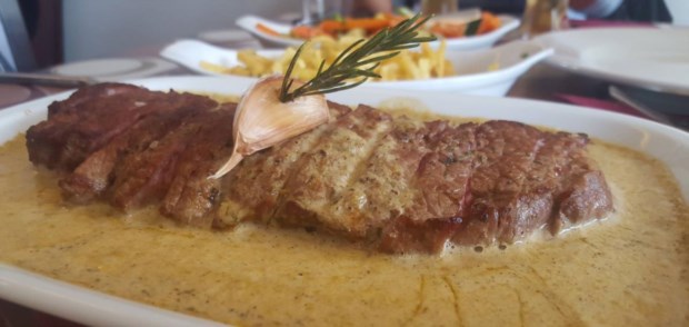 Mas se quiser continuar, salte para os pratos principais, onde França também se pode sentar à nossa mesa com um maravilhoso entrecôte parisienne. Saladas, massas, pratos vegetarianos (estrogonfe de cogumelos e natas de soja, couscous, legumes salteados no wok, etc)… E os acompanhamentos que podem ser escolhidos mediante o prato principal por que se opte. Assim, se se decidir por um bacalhau fresco com aroma de alho e coentros, pode optar pela batata cozida, frita, legumes, puré de batata trufado… É à escolha do freguês e é válido para tudo, das bochechas de porco preto ao salmão grelhado com alcaparras e molho de ervas, passando pelos pratos já acima referidos e por uma novidade – a carne maturada.