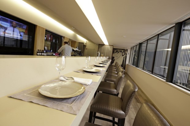 Como elemento decorativo central, a garrafeira que se estende ao longo de todo o prédio numa parede envidraçada que separa a área de balcão e salão de refeições.