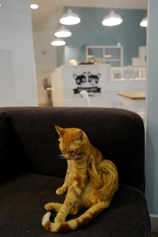 Já ao contrário do que sucede com outros cafés de gatos pelo mundo, o português tem uma particularidade: divide-se em dois espaços, tão unidos quanto separados – no caso por vidro. A razão: a legislação portuguesa, que impede a presença de animais em espaços públicos de alimentação. Embora noutros países os café de gatos (que vivem um verdadeiro “boom” do Japão à Áustria passando por Espanha, França ou EUA) unam os clientes com os felinos num só local, aqui, apesar da casa ser uma, há este apartheid, uma divisão clara, criada para obedecer à lei lusa e deixar a restauração de parte. Mas os bichinhos estão logo ali, na área que é também uma biblioteca, bem apetrechada, claro, de livros, mas também com sofás ou armário (para guardar o casaco, se quiser, antes de dedicar-se às festas). Entre as duas áreas há zona de higienização, nomeadamente a área do "staff" (gatinhos incluídos).