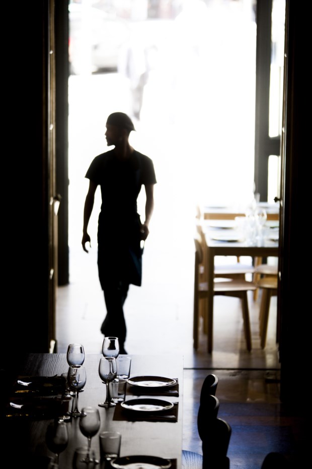 Quando chegamos ao Café Garrett, Leopoldo está sentado ao fundo de uma longa mesa situada em frente ao balcão. O restaurante está organizado em L, ocupando dois espaços, um próximo da montra da fachada virada para a Estação do Rossio e outro mais interior, ao lado do átrio do teatro. Há ainda uma pequena esplanada, com planos para crescer. Damos estas explicações porque não é fácil perceber que existe um restaurante aqui e os lisboetas não estão (ainda) habituados à ideia de que é possível entrar no teatro apenas para comer – ou, claro, para jantar antes ou depois de um espectáculo.