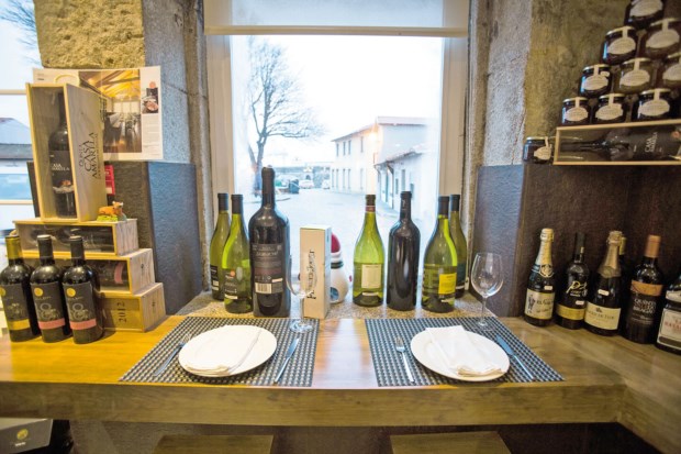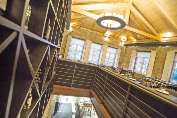 Decoração de estilo moderno, sóbrio e elegante em tons escuros, com destaque para a garrafeira que cobre toda a parede onde se agarram as escadas. Tecto alto e vigamento em madeira clara a criar um ambiente amplo e desafogado, para o que contribuem também as oito janelas que rasgam as fachadas sul e poente do pequeno edifício. Mesmo assim, e juntando a cuidada luz indirecta, há um efeito algo intimista de luz quebrada intencional.
