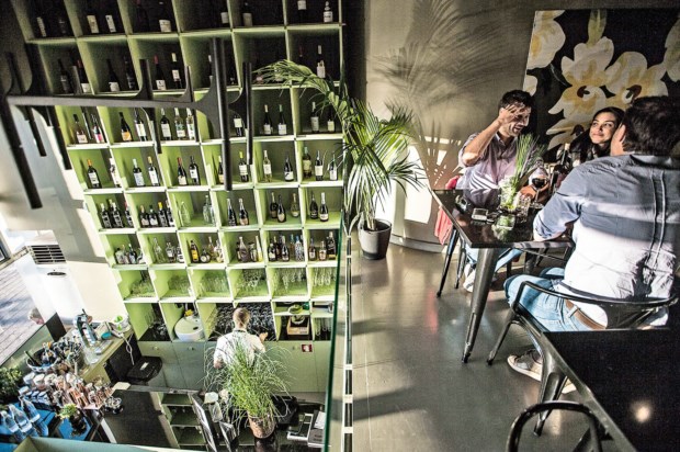 Entramos para o que aqui se chama bar e bistrô, o rés-do-chão, balcão diante de estante que sobe até ao tecto, pé direito alto o suficiente para albergar uma mezzanine que é um “outro” espaço, o wine lounge. A música que toca é lounge (à noite torna-se mais “moderno, sofisticado”) e enche suavemente os espaços entre as paredes verde seco: há vários vasos com plantas e no andar superior um quadro que ocupa a totalidade de uma parede ostenta o logótipo, motivos florais sobre fundo escuro — do tecto pendem ventoinhas que são decorativas (a rotação é sempre a mesma): uma espécie de flor ou trevo, já que verde é a sua cor (e todo o espaço também é uma homenagem ao Brasil, país do pai de Sebastião e parte do seu próprio percurso). Se no rés-do-chão a proposta são bancos altos no balcão e num pequeno pousa copos, no andar superior são mesas que se alinham — poucas, porque o espaço não é grande, embora um espelho lhe dê profundidade e permite que a luz (mais uma nesga de mar) ali se reflicta: o negro é a cor que uniformiza em mobiliário de design, neste caso Tolix.