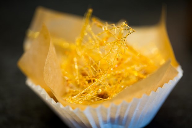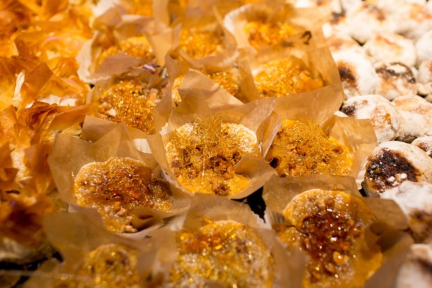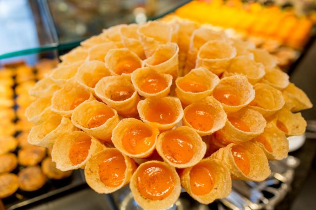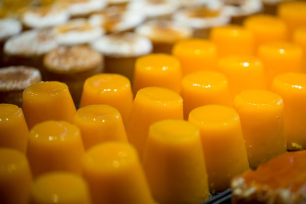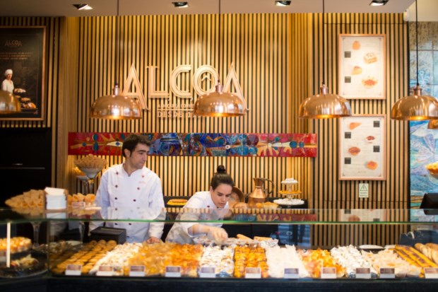É difícil não dar por estes doces conventuais elegantemente colocados de pé quando se passa em frente à montra. São de longe o doce mais vendido pela pastelaria que vem de Alcobaça e se instalou há duas semanas em Lisboa, diz Paula Alves, a proprietária. E lá dentro podemos fixar-nos nos bolos — castanhas de ovos, manjar dos deuses, diário de D. Inês, mimos de freira, torrão abadessa… (“uma joalharia de bolos”, como Paula Alves ouve alguns clientes comentar) — ou ficar a olhar para as paredes.