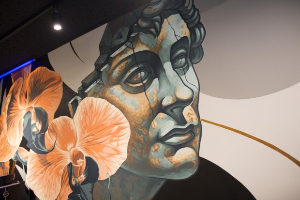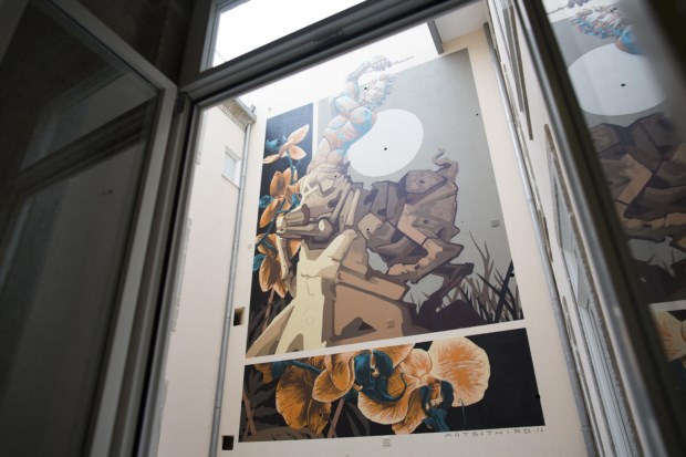 É aqui que está o pátio de onde houve Páteo das Flores. É amplo e iluminado – a cobertura de vidro deixa entrar a luz natural e ver o graffiti que os artistas Thirds & Mots pintaram numa parede de dez metros. Tem 11 mesas redondas com tampos de madeira obtidos através do corte de raízes e troncos de árvores, um enorme jarrão onde se mostra um feto viçoso, uma lareira falsa e no chão cerâmica que nos remete para a calçada portuguesa.
