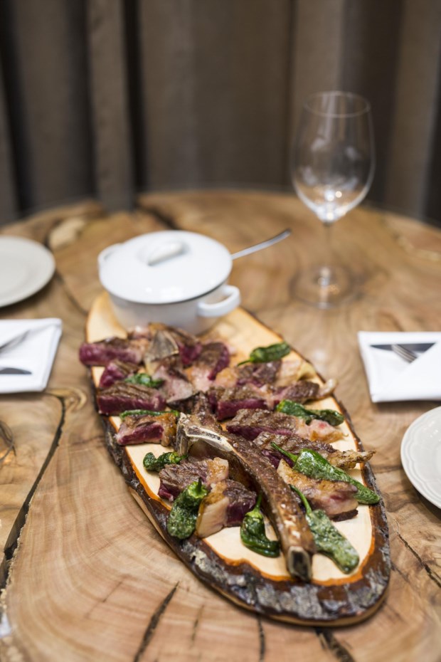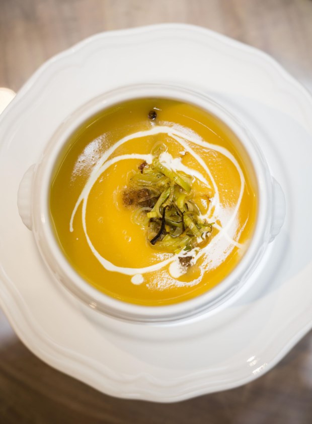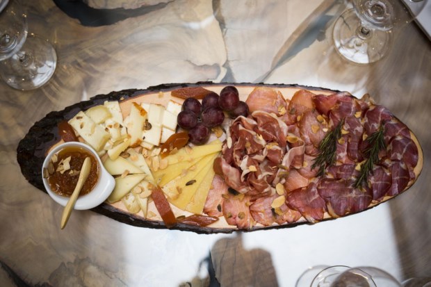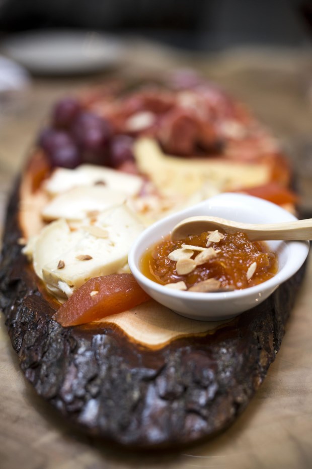 É neste espaço que nos sentamos para provar os petiscos com a assinatura do jovem chef Raul Sousa (23 anos). Começamos com uma tábua de queijos (16€) e enchidos (18€), que acompanhamos com pão estaladiço e Titular Branco (4€) no copo. Avançamos depois para uns deliciosos chips de batata-doce (4€) e, por gosto pessoal, declinamos os pimentos Padrón. Aceitamos a sopa (creme de cebola, muito bem confeccionado) e, por sugestão de Bernardo, mudamos de poiso, agora para o saguão, espécie de surpresa que se guarda para o fim da visita.