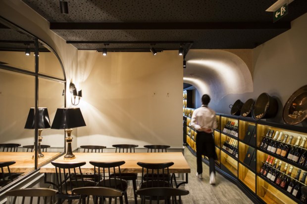 Deixamos o copo em cima de uma destas mesas (Ziya Concept) e percorremos o túnel que dá acesso à “sala de grupos”, como a classifica Bernardo Sampaio. Tem duas mesas corridas, que acomodam seis pessoas cada, candeeiros que Pedro Mourão resgatou “no ferro-velho” e, ao lado esquerdo, estantes onde se alinham dezenas de garrafas de vinho. “Somos um wine bar”, reitera Bernardo, sublinhando que aqui estão disponíveis mais de 100 referências, boa parte das quais da região do Douro.