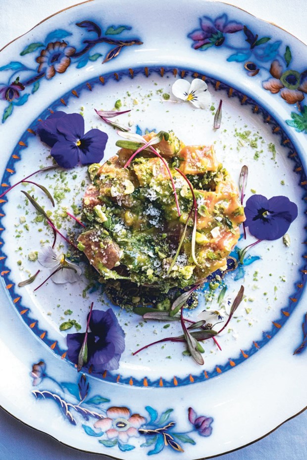 Numa era de pratos bonitos, é justo que se diga que este, simplicíssimo, faz parar a conversa e cria um pequeno momento de encantamento. É um torricado de cavala, que tem como base uma focaccia (receita do chef mas feita numa padaria vizinha) e vem decorado com pequenas begónias comestíveis cor-de-rosa vivo. Quando o provamos, revela o mesmo delicado equilíbrio de sabores que o seu aspecto deixava adivinhar. Tem ao mesmo tempo uma honestidade de sabor e uma elegância sem pretensiosismo.