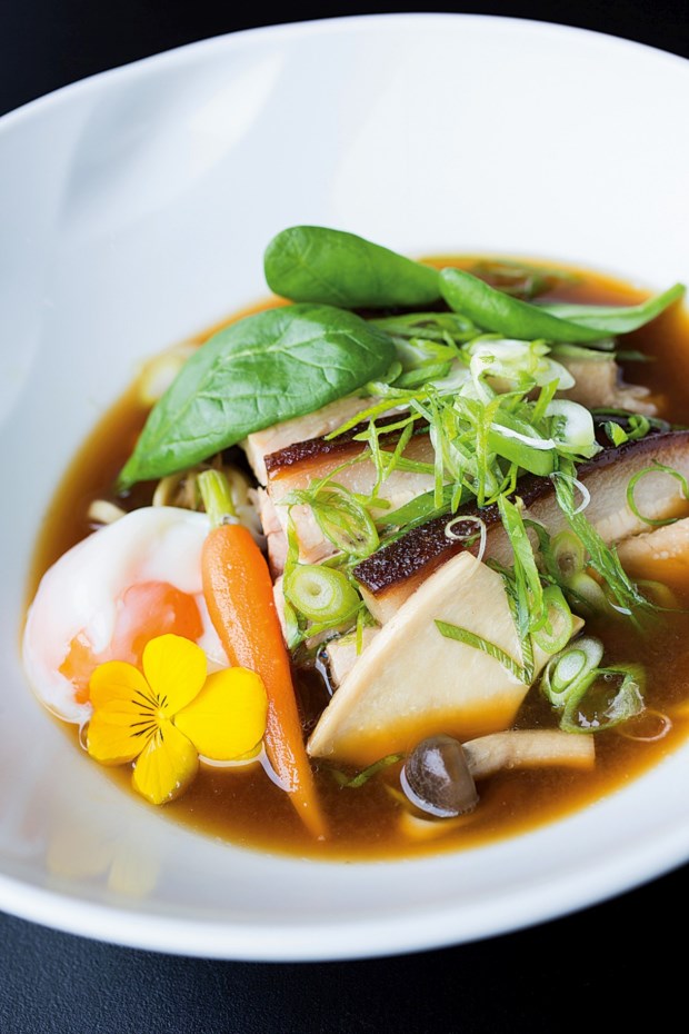 E, depois desta fusão inesperada, vem um clássico dos clássicos: ramen de barriga de porco com ovo a baixa temperatura. “Usamos algumas técnicas ocidentais como as baixas temperaturas, mas o coração da ramen, que é a massa e o caldo, é 100% tradicional. O importante aqui é a atenção aos pormenores. Aquele caldo demora 48 horas a fazer, são 48 horas com uma pessoa a tomar conta de um caldozinho, que é feito com legumes, carne de porco, pés de porco, entrecosto, toucinho de porco preto. Apesar de a massa ser feita aqui, diariamente, à mão, o segredo da ramen está todo no caldo.” A carta oferece ainda outras opções de ramen, uma de camarão “com um twist mais tailandês”, com espuma de coco e raspas de lima, e uma com frango katsu, passado por panko (pão ralado japonês) e frito, “com uma gema super-cremosa, a baixa temperatura”.