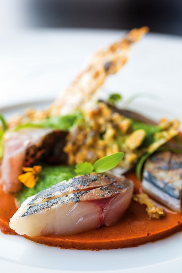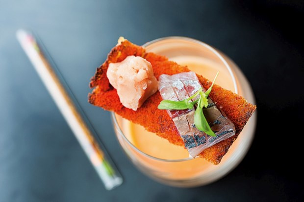É aí que se pode provar um amuse bouche de enguia com foie-gras, molho teriaki e esferificação de laranja sanguínea, um sashimi de salmão com puré de ervilhas e hortelã e chips de raíz de lotus, o sashimi de carapau com molho à espanhola, ou - em pratos com uma apresentação cuidadíssima - um shimesaba de cavala (shimesaba significa que o peixe é marinado, com vinagre de arroz) com dashi e edamame (esfera de dashi tendo no interior um grão de soja do edamame, que é a vagem), tofunaise (maionese de tofu) de alho negro e cerveja.